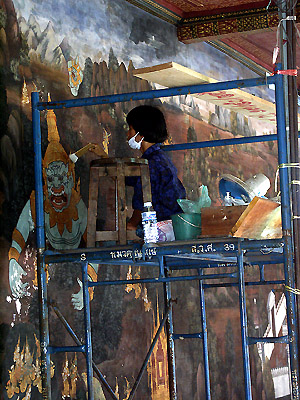 Frescoes require constant upkeep in a region of high heat and humidity. Here's a worker