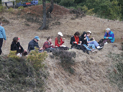 Our group having a picnic on a ridge top with the usual fare of cheese sandwiches, hard