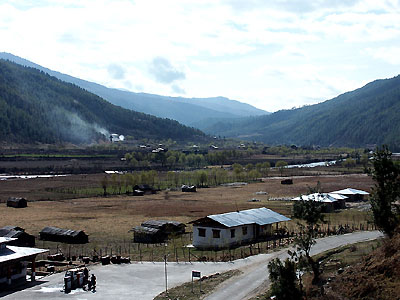 A view of Bumthang valley looking west from our hotel, the River Lodge. Much of the landscape