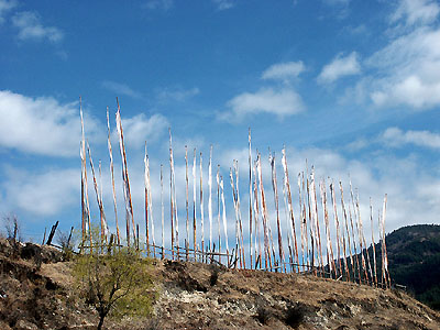 A line of prayer flags on a ridge outside of Jakar.