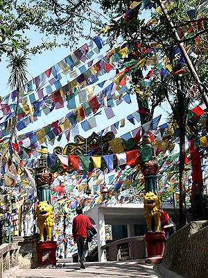 Colorful prayer flags on the way up to the hill summit.