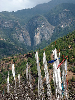 Across the road, that little dot high on the adjacent cliff is Tiger's Nest, Taksang, the most famous