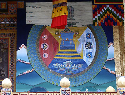 This is one of three large mandalas painted on the outer wall of the massive inner