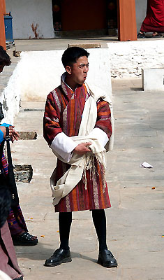 Here's a male resident of Punakha in his Sunday best gho. The white silk scarf wrapped around