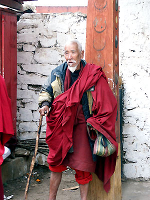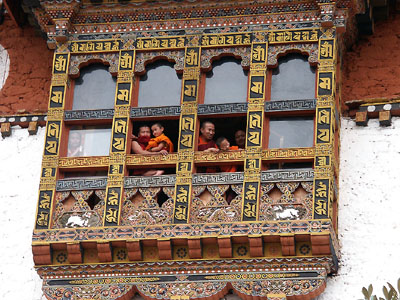 The monks and Lamas of the Punakha Dzong watch the closing ceremonies from an upper story window.
