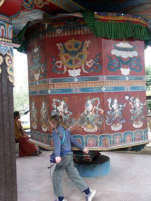Here is all 60 pounds of Amanda getting a large prayer wheel spinning.