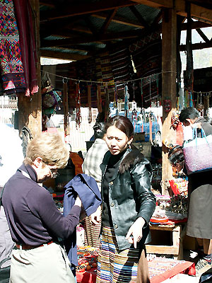 Here Bonnie from our group does some haggling with Cheme. Negotiating prices in Bhutan is