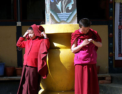 Two nuns in the afternoon sun. This nunnery is currently presided over by a Lama, Tang Rinpoche, who immediately