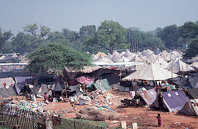 Another view of the tent city. In the foreground youngsters play amidst the garbage heaps, mud and god knows what