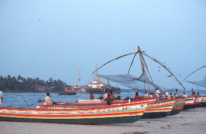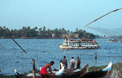Here's a local ferry carrying commuter to the tip of Fort Kochin, with fishermen in the foreground. The cost of the