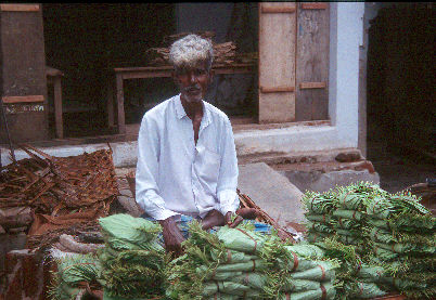 This is a local paan vendor on the streets of Madras. Paan is a mixture of spices, including the betelnut, which has