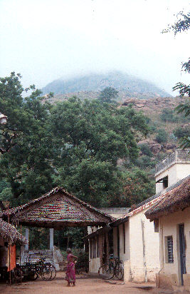 A scene of Arunachala moutain enshrouded in clouds taken from near the main gate in Ramanashram.