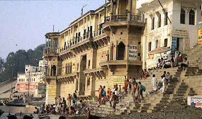 Some of the architectural variety around the banks of the Ganges. Maharajs and the wealthy from all parts of India have built residences on the banks here, creating interesting architectural diversity. The waters of the Ganges sometimes overflows - in 1962 it reached up to rightmost balcony.