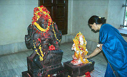 The temple is supposed to be a replica of an earlier Vishwanath temple destroyed by Muslim invaders. Here is a woman making an offering to Shiva and his son, Ganesh, the Elephant God, the god of good fortune and luck. The red color is from a powder call kum-kum, used in Hindu puja ceremonies.