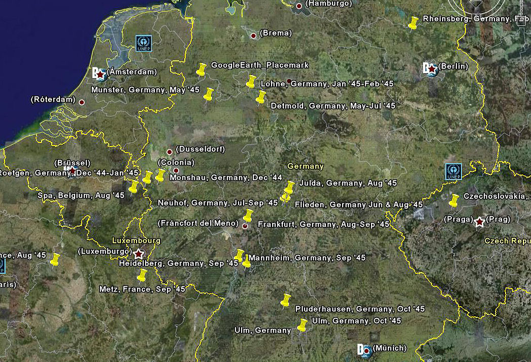| August 1945 | Paris, France; Rheims, France; Fulda, Germany; Spa, Belgium; Frankfurt, Germany; Flieden, Germany, somewhere in Czechoslavakia |