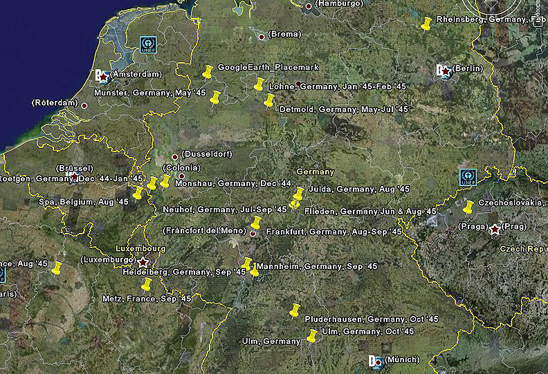 | September 1945 | Neuhof, Germany; Frankfurt, Germany; Mannheim, Germany; Metz, Framce; Heidelberg, Germany; Fulda, Germany |